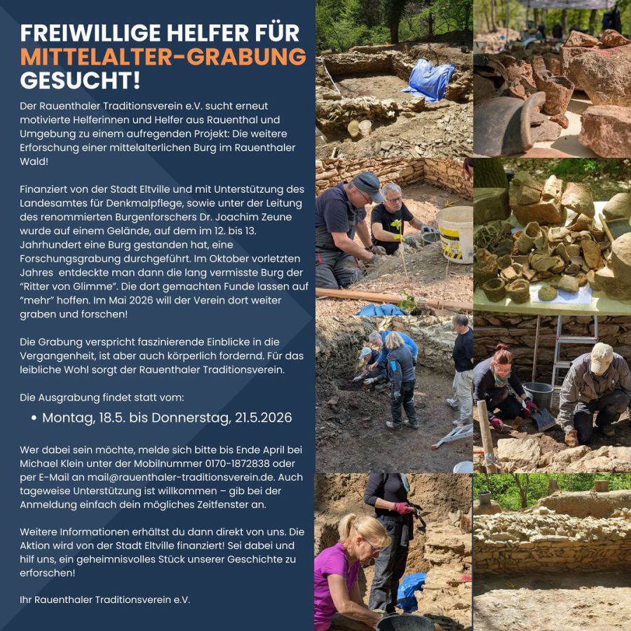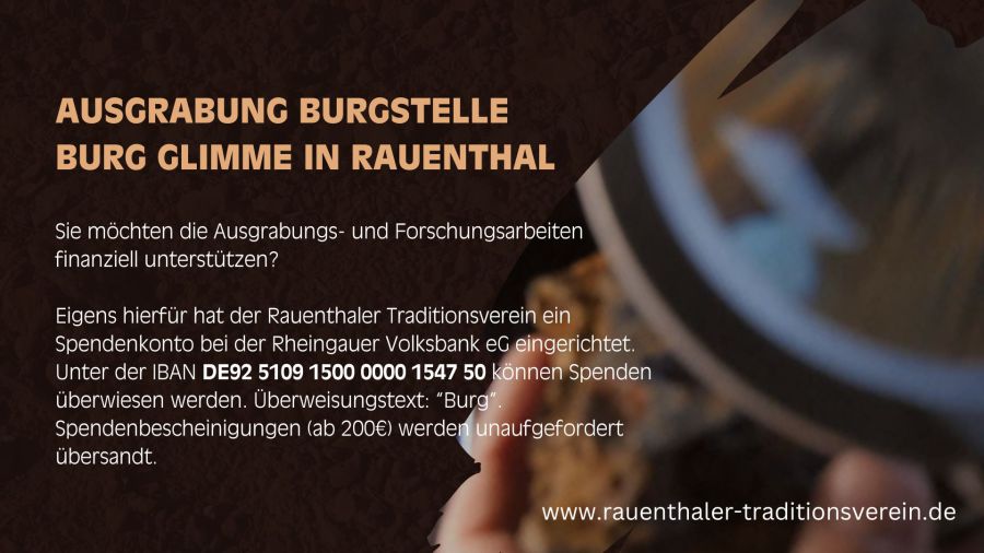 Der 2022 durch legalisierte Sondergänger zufällig entdeckte Burgstall bei Rauenthal wurde nach einem positiven Prospektionsergebnis in Zusammenarbeit mit HessenArchäologie und dem Traditionsverein Rauenthal im Herbst 2024 & Frühjahr 2025 unter Mitwirkung zahlreicher ehrenamtlicher Helfer archäologisch erforscht. Hierbei lag die fachliche Aufsicht bei Verfasser.